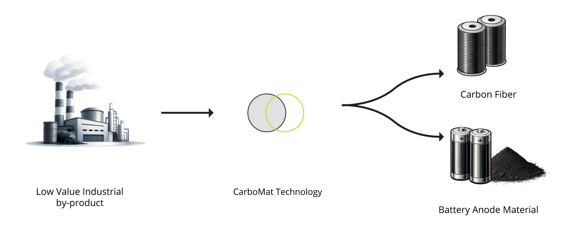 CarboMat is currently commercializing a low-cost sustainable technology to produce carbon fibers and anode materials derived from low-value industrial by-products (including bitumen by- products) for multifunctional applications in the composites and battery industries.